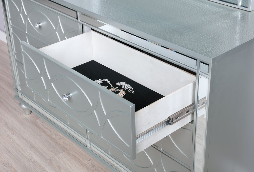 Transform your bedroom with the transitional elegance of our six-drawer dresser and its accompanying mirror. The dresser's vibrant silver metallic finish and fret work detail on the front panels exude modern glam, while the crystal-like pulls and black felt-lined top drawers add a touch of luxury. Delicate bun feet complete this exquisite dresser, making it a stunning showpiece. The rectangular mirror, with its decorative fret work frame and beveled edges, enhances the glamor and radiates sophistication, perfect as a standalone piece or paired with the dresser.